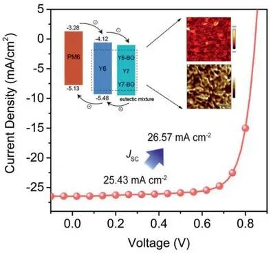 近年来,有机光伏领域由于新型受体材料的开发而迅速发展,器件光电转换效率已经超过18%。由于有机半导体中光生激子的本征物理特性,以及有机半导体薄膜较低的迁移率,本体异质结形貌一直是影响器件性能的关键因素。早期的研究中,受体材料主要采用富勒烯受体PCBM,该材料电子传输性能好,结晶性弱,形貌简单。而非富勒烯受体材料多样性高,物性差异大,给受体的结晶可以诱导形成多尺度的复杂结构,形貌调控难度大,构效关系不明确。如何理解非富勒烯共混薄膜内部的运作机制,并有效地指导新型材料的开发和器件制备工艺的改进,是效率进一步提升的关键。解决非富勒烯体系的形貌问题,核心思路是解决非富勒烯受体结晶形貌的问题。近年来Y6类受体的出现极大地提升了器件的效率,而其结晶形貌的调控依然比较困难。课题组在认识到Y6受体特殊的类聚合物堆积结构的基础上,对其结晶形貌优化开展了一系列的工作,通过受体材料之间相互作用来调控共混膜的整体形貌。通过合理的材料筛选,构建了Y6-Y6-BO,Y7-Y7-BO受体组分对,最终构建成功窄片层晶体堆积(eutectic lamellae),这一成果近期以“High‐Efficiency Organic Photovoltaics using Eutectic Acceptor Fibrils to Achieve Current Amplification”为题,发表在Advanced Materials 上。