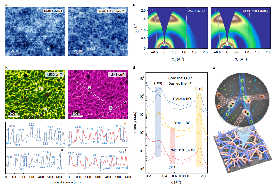 2022年5月5日,国际知名学术期刊Nature Materials刊发课题组最新研究工作,通过双纤维网络策略制备的有机太阳能电池光电转换效率达到19.6%,填充因子接近82%,并获第三方独立机构福建省计量科学研究院国家光伏产业计量测试中心的认证(NPVM:19.2%),是目前有机太阳能电池单结器件报道的最高效率。基于双纤维形貌的形成机制,课题组总结了构筑双纤维形貌结构的材料选择原则并验证了其普适性,该工作实现了有机光伏薄膜形貌特征尺度与光物理核心参数的匹配,为后续高效率有机太阳能电池的制备提供了新思路。