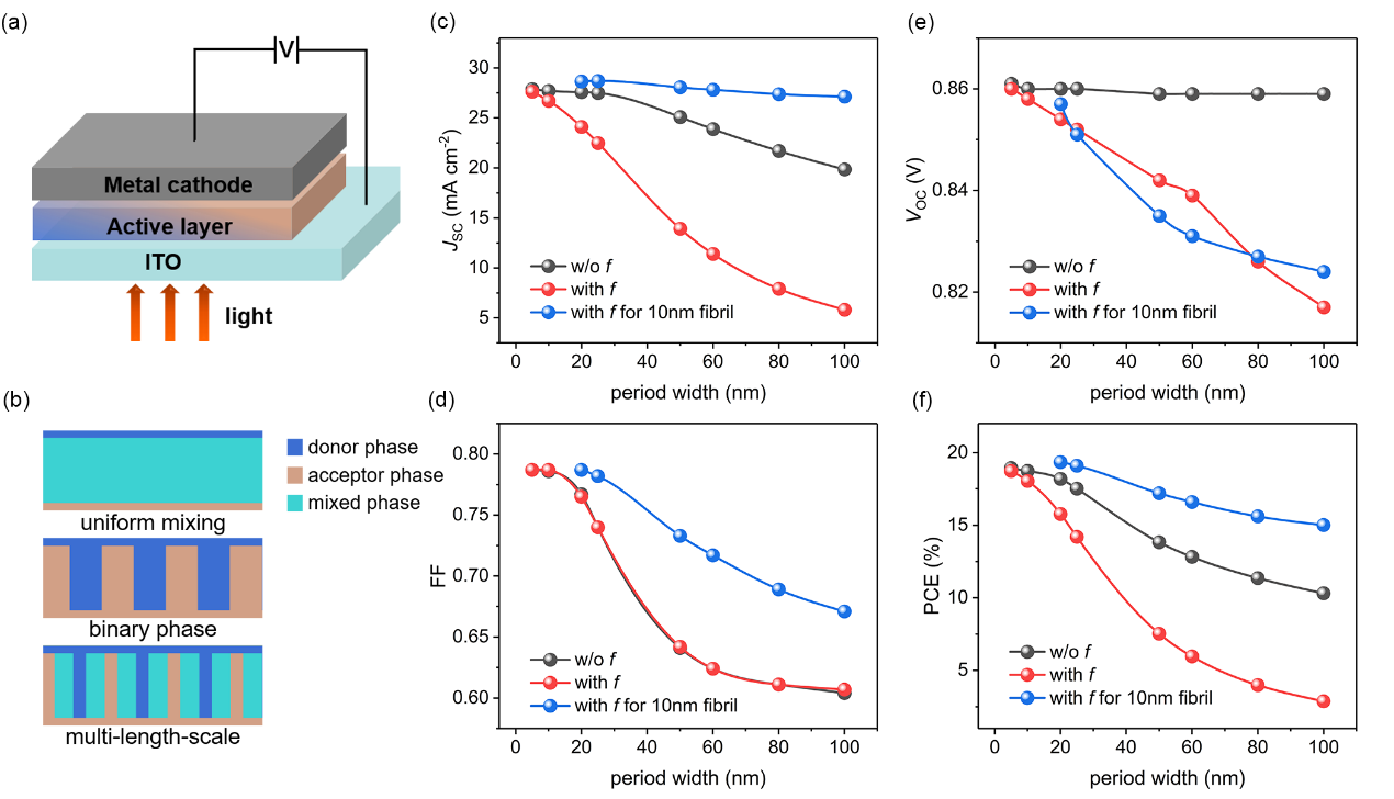 近年来,非富勒烯受体(NFAs)材料的开发拓展了活性层的光谱吸收范围,优化了异质节的能级配对,器件效率大幅提升,现今单节电池效率已达到19.6% (Nature Materials, 2022, DOI:10.1038/s41563-022-01244-y)。非富勒烯受体一般具有良好的结晶性,共轭聚合物给体一般表现出纤维结晶形态,因此非富勒烯有机光伏电池薄膜表现出了双结晶性功能相与非结性共混相,呈现出多尺度相分离形貌。该形貌框架界面多元,其组成与特征尺寸对激子解离、电荷传输、载流子复合具有重要影响。为了探索多尺度形貌下的光电转换过程,课题组博士生郝天雨、博士后钟文楷、硕士生冷石峰通过理论与实验相结合的方法,构建了双晶体态分散在共混态中的多尺度形貌模型,并与均一共混形貌、二元插指形貌进行对比,研究多尺度形貌的光电转换特征。通过定义形貌依赖性的激子解离率,依据有机给受体材料的基本物性,可使用扩散-漂移方法来模拟器件工作过程,预测器件性能。该工作以“The Structure-Performance Correlation of Bulk-Heterojunction Organic Solar Cells with Multi-Length-Scale Morphology”为题发表于 Science China Chemistry上。