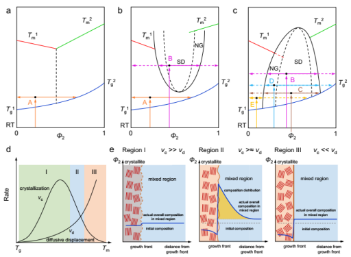 有机光伏薄膜活性层形貌是提升器件能量转换效率的重要因素,多维度、多层次对有机光伏薄膜形貌进行优化是本领域研究的重要组成部分。为了制备更高效率的器件,除了在制膜过程中对形貌进行优化外,在薄膜后续加工处理中对形貌也需要进行进一步优化。由于有机光伏材料自身结构的特异性以及在成膜过程中典型的非平衡态特点,高分子科学中常用的基于Flory-Huggins理论的平衡态相分离相图在该体系中的适用性不高。目前有机光伏领域亟需一个综合且通用的模型来描述在非平衡态下的活性层形貌转变以及转变对于器件性能的影响,以加深领域内对于形貌演变的理解及后续通过形貌优化及形貌锁定来提高器件的效率及稳定性。针对这个关键科学问题,项目团队设计与开发了基于同步辐射原位退火形貌动力学演变的研究。通过原位与静态的同步辐射X射线散射,结合DSC等热分析手段,系统地研究了四个具有代表性的基于富勒烯的有机小分子体系在热退火过程中的形貌演变过程,发现结晶与相分离的耦合与竞争对多尺度形貌演变、相纯度和界面取向等有重要的影响,同时在此基础上提出了一个统一的基于非平衡态热力学相图的用于解释形貌转变的模型,相关成果发表在Nature Communications上,题目为“The coupling and competition of crystallization and